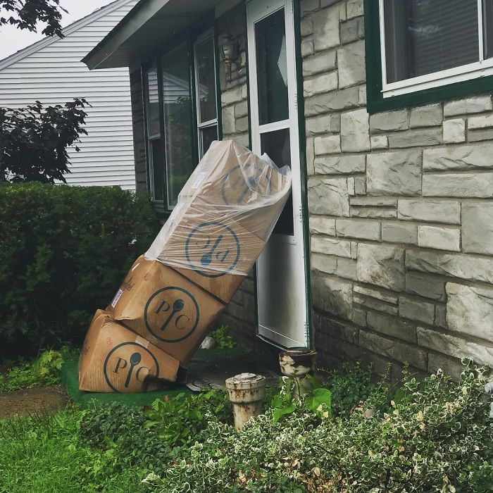 Kartony przewróciły się na drzwi przez co właściciel nie umiał ich otworzyć.